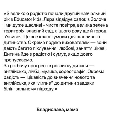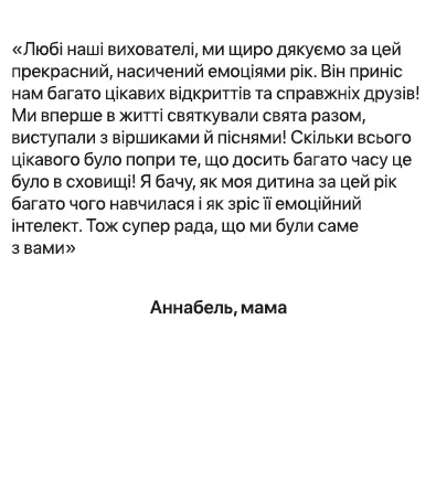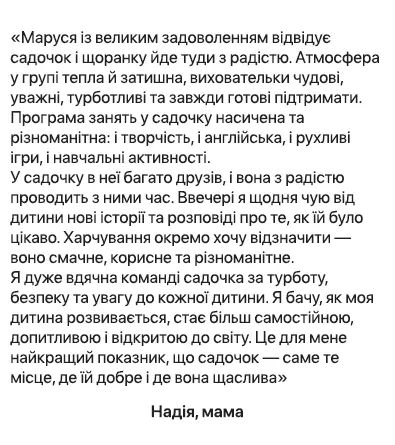 Ми намагаємось зробити адаптацію максимально лагідною. Уважно спостерігаємо за кожною дитиною: одні звикають швидше, іншим потрібно трохи більше часу. Важливо, щоб і батьки були готові до нового етапу в житті своєї родини та з довірою відпускали дитину в садочок.